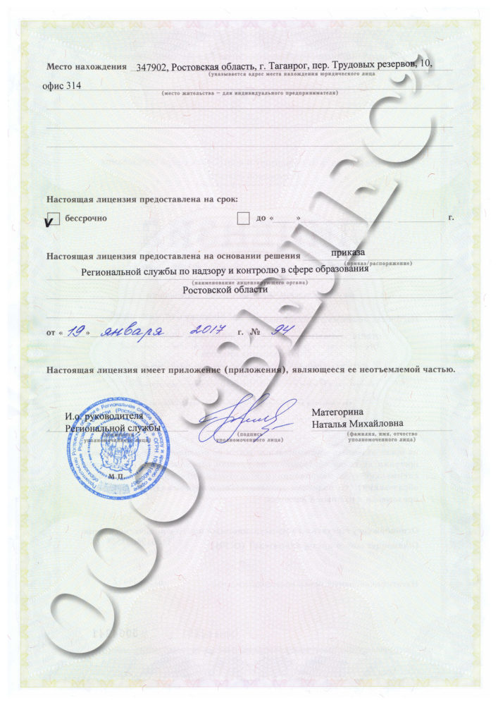 Лицензия выданная Региональной службой по надзору и контролю в сфере образования Ростовской области на право оказывать образовательные услуги по реализации образовательных программ подвидам дополнительного образования: 1. Дополнительное образование детей и взрослых 2. Дополнительное профессиональное образование Номер лицензии в реестре 6565 от 19.01.2017г. Серия 61Л01 №0004241
