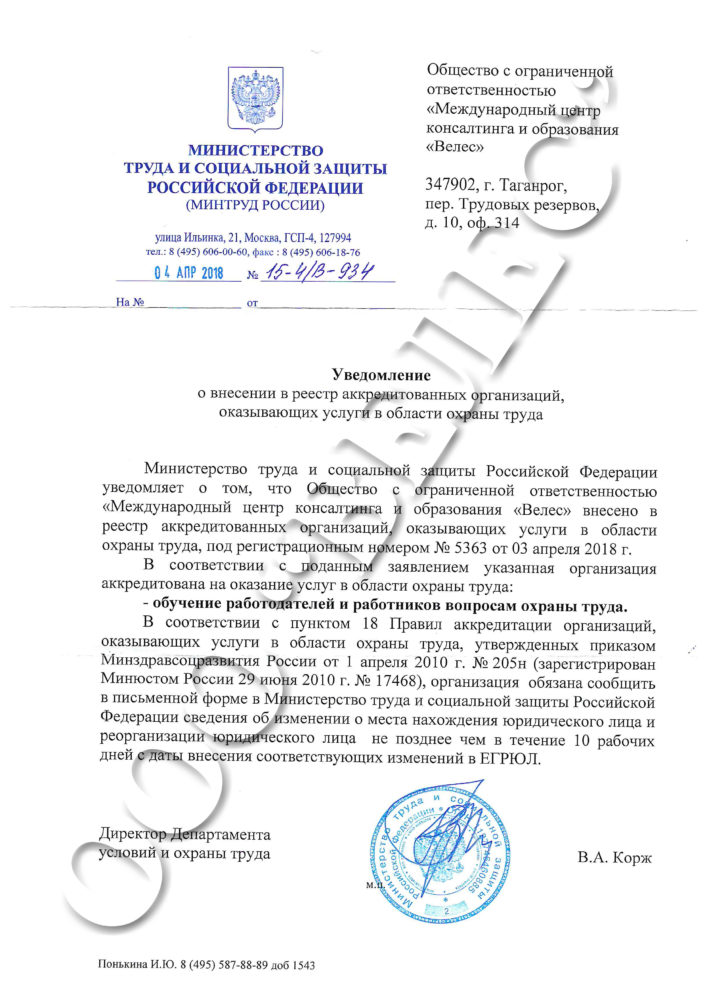Аккредитация Министерства труда и социальной защиты Российской Федерации в области проведения обучения работодателей и работников вопросам охраны труда. Регистрационный номер в реестре 5363 от 03.04.2018г.
